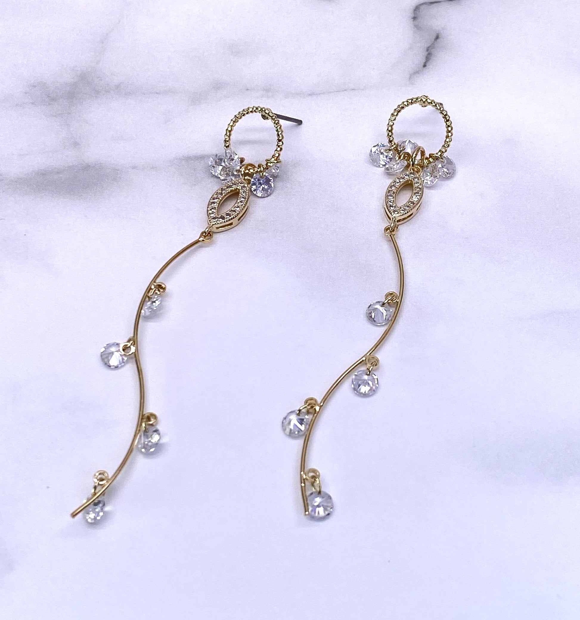 日本未入荷のキラキラと光る5つのキュービックジルコニアをピアス金具。美しいキュービックジルコニアが4個付いている、長さ約50㎜のウェーブゴールドパーツ。
